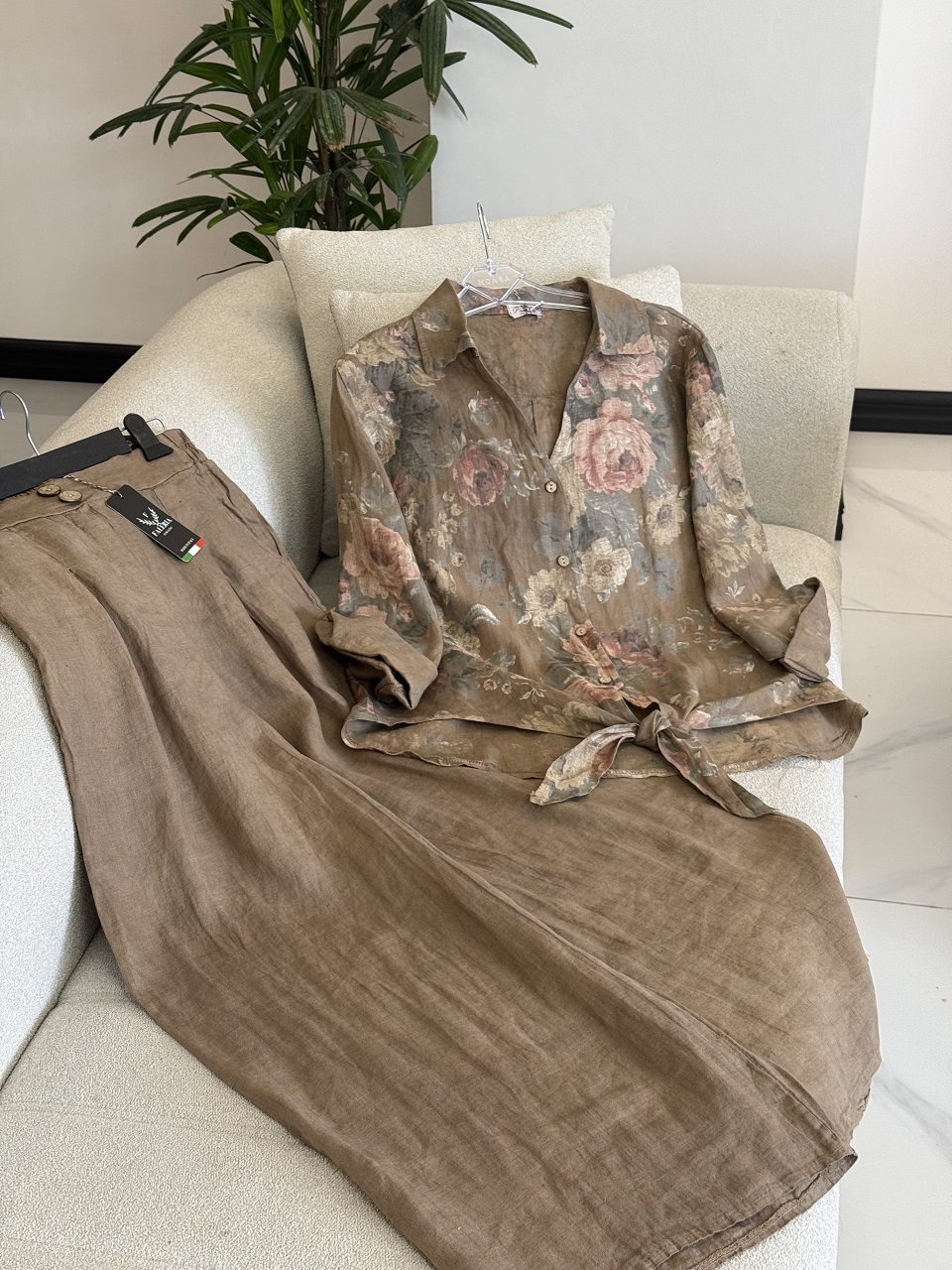 ست شومیز و شلوار لینن ایتالیایی طرح جلو گره ای رز مات