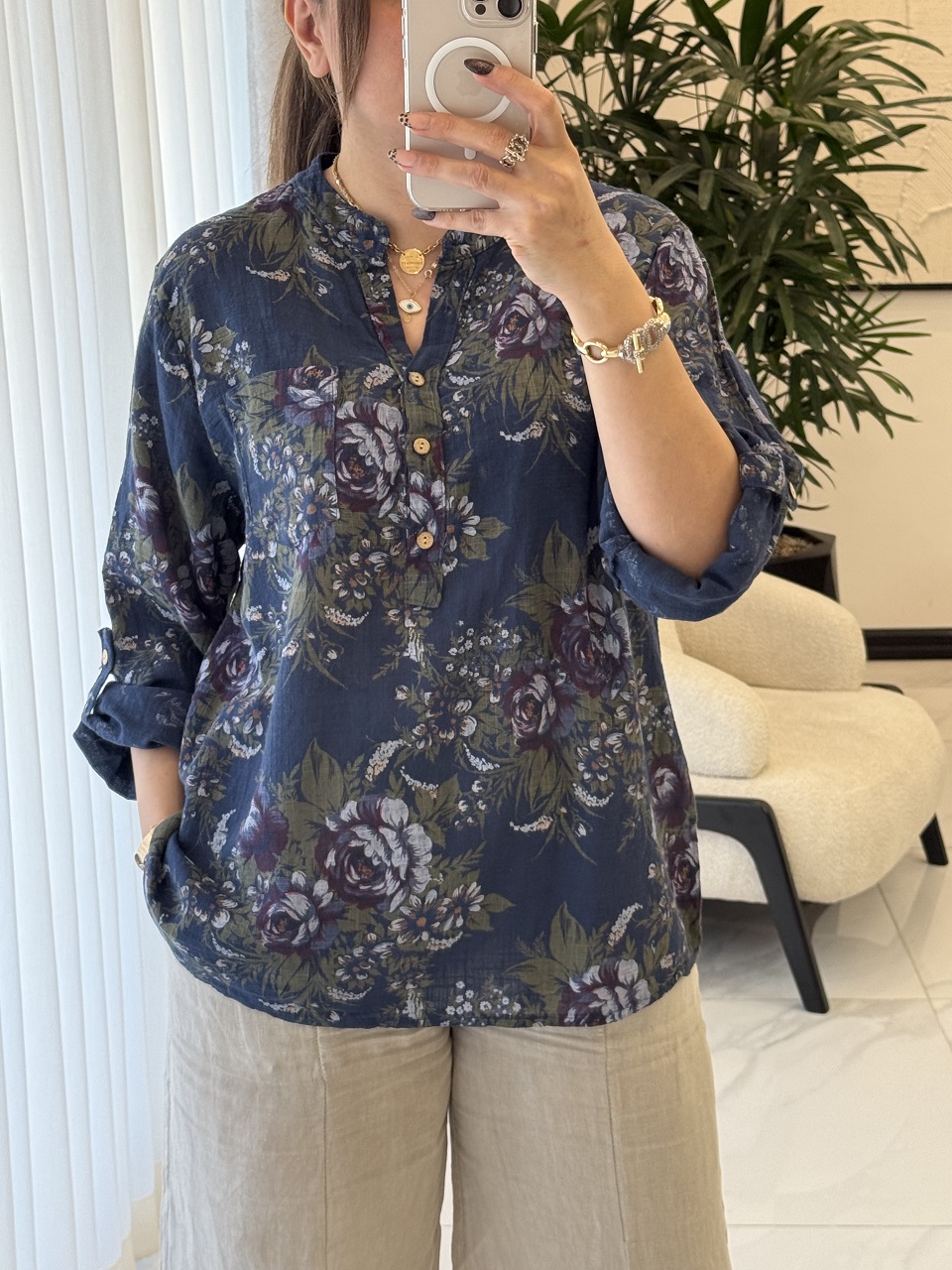 شومیز لینن ایتالیایی طرح گل ریز - گرم بالا