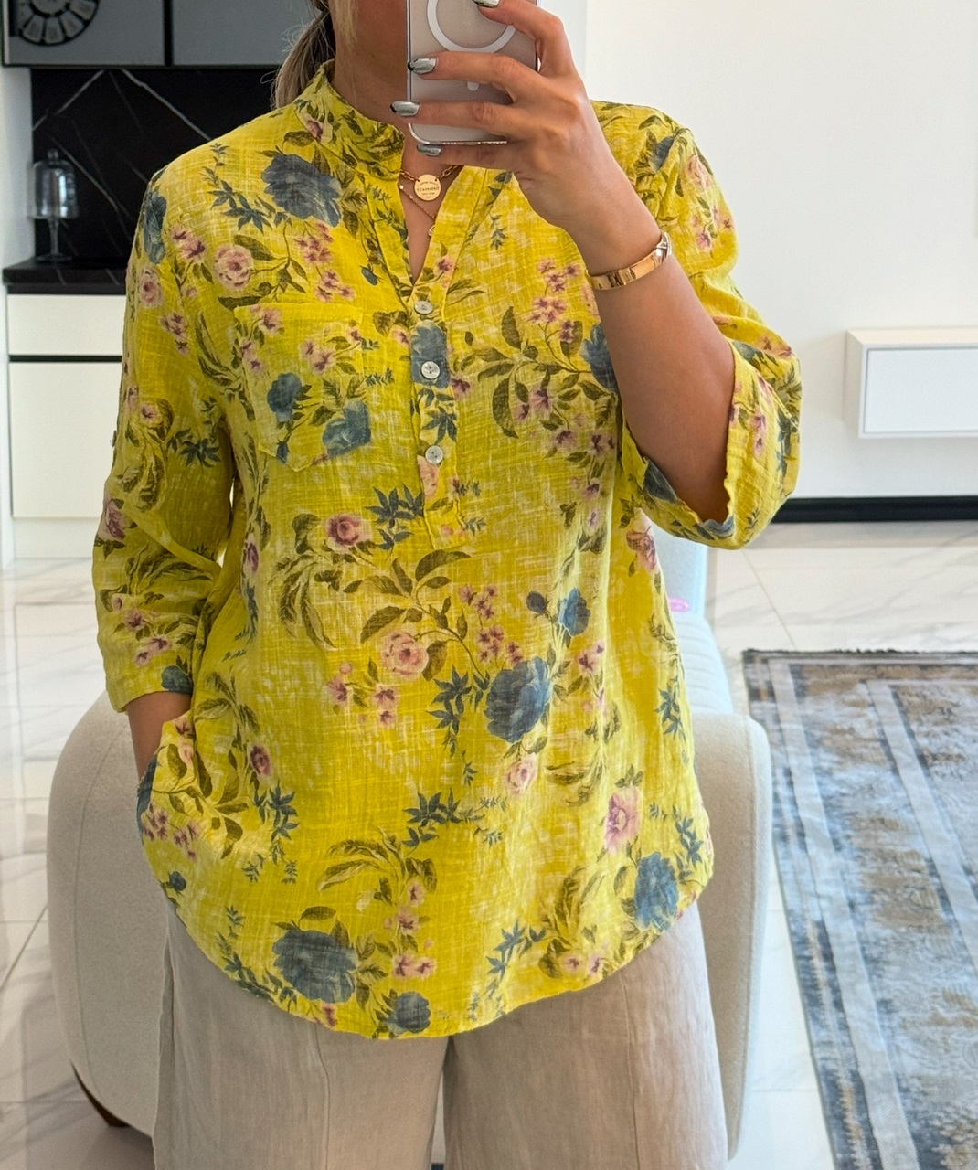شومیز لینن ایتالیایی سه دکمه طرح گل آبی