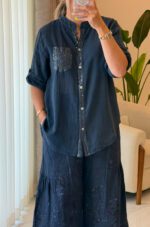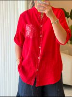 شومیز لینن ایتالیایی جیب پولکی تمام دکمه