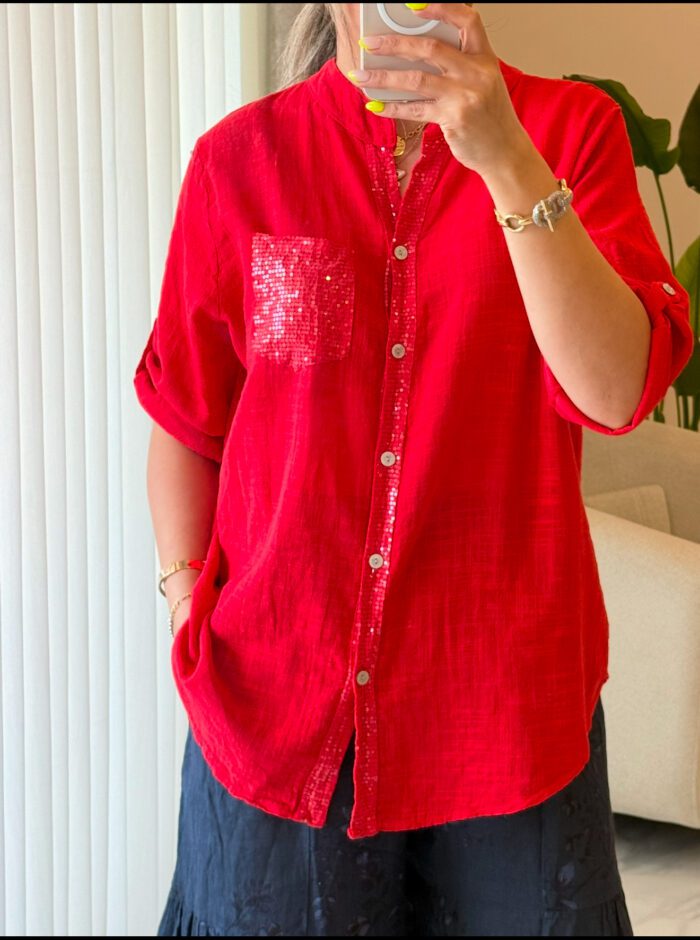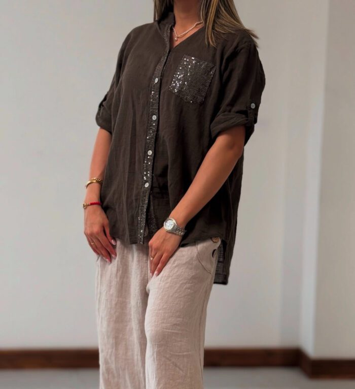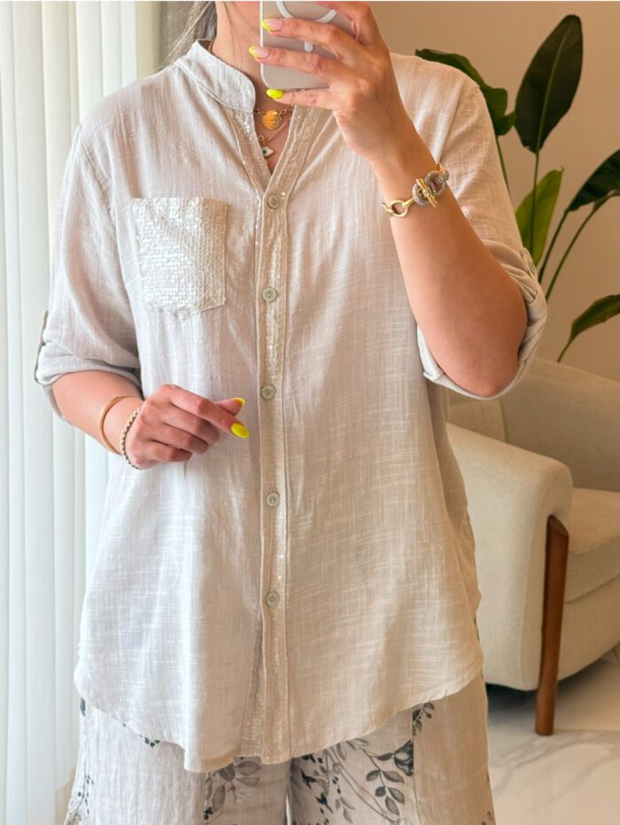 شومیز لینن ایتالیایی جیب پولکی سه دکمه